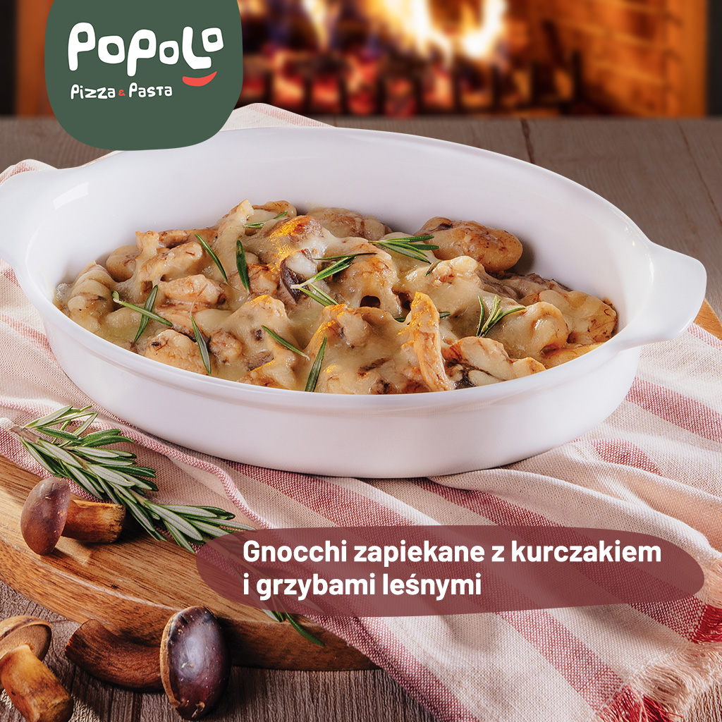 gnocchi w sosie grzybowym z kurczakiem 70g i podgrzybkami zapiekane serem mozzarella