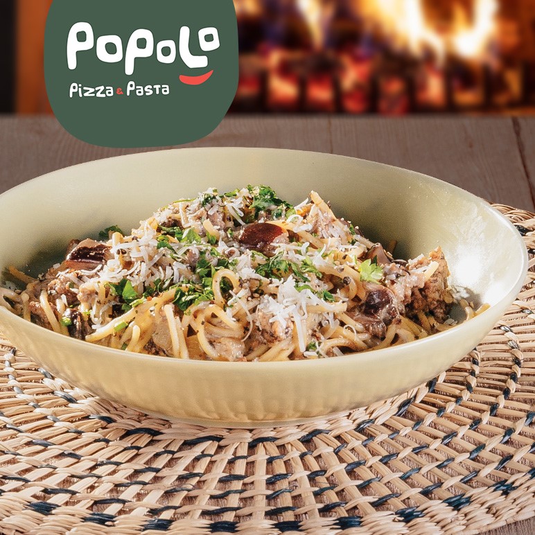 spaghetti w śmietanowym sosie na bazie wołowiny, wieprzowiny, podgrzybka z natką pietruszki i Grana Padano