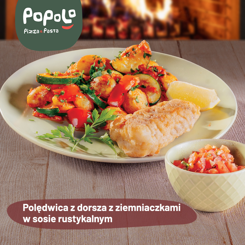 polędwica z dorsza 90g z ziemniaczkami w mundurkach, cukinią i papryką w sosie pomidorowym, podawana z salsą pomidorową doprawioną TABASCO® Sriracha Sauce